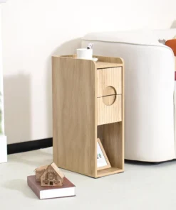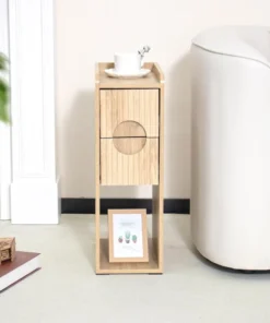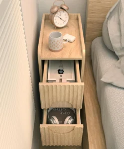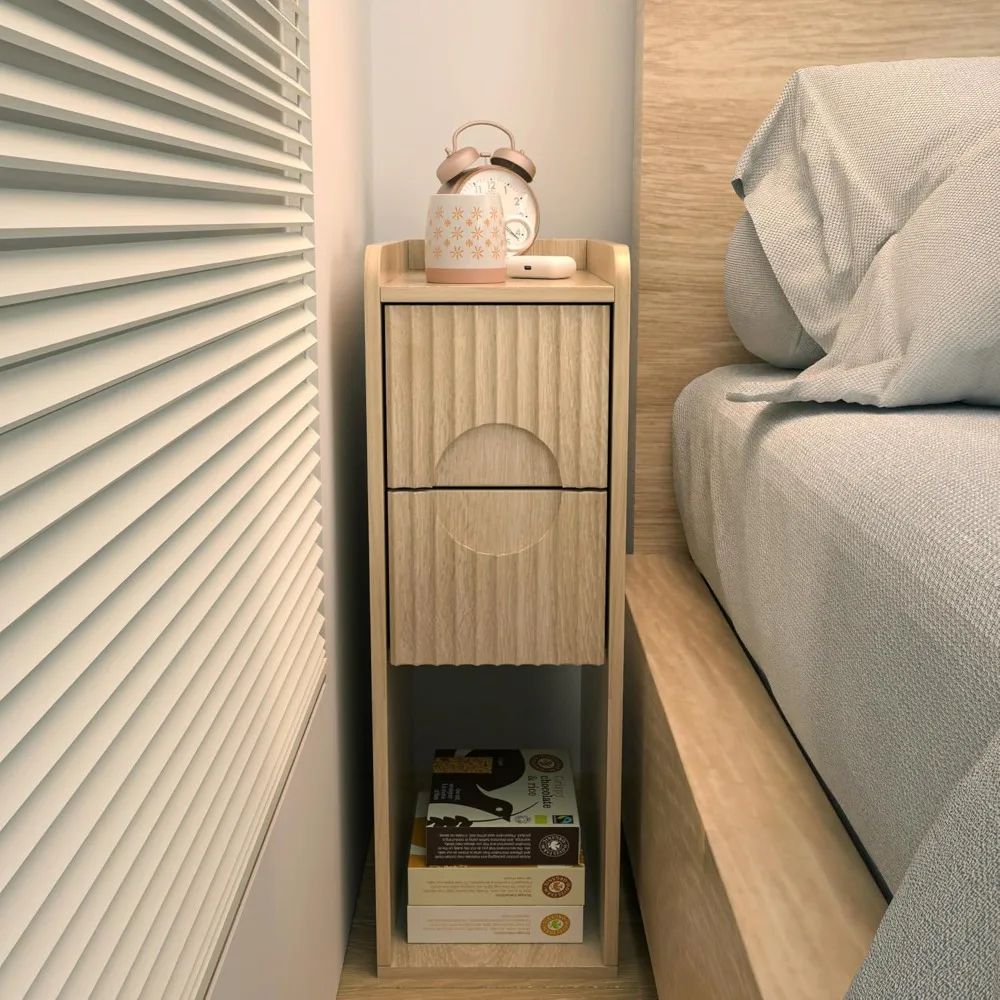 Fluted Nightstand Set of 2, Wood 2 Drawer Narrow Nightstand, Slim Side Table, Modern Boho End Bedside Table, Natural Wood
